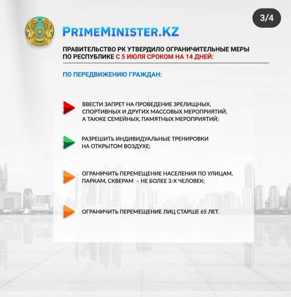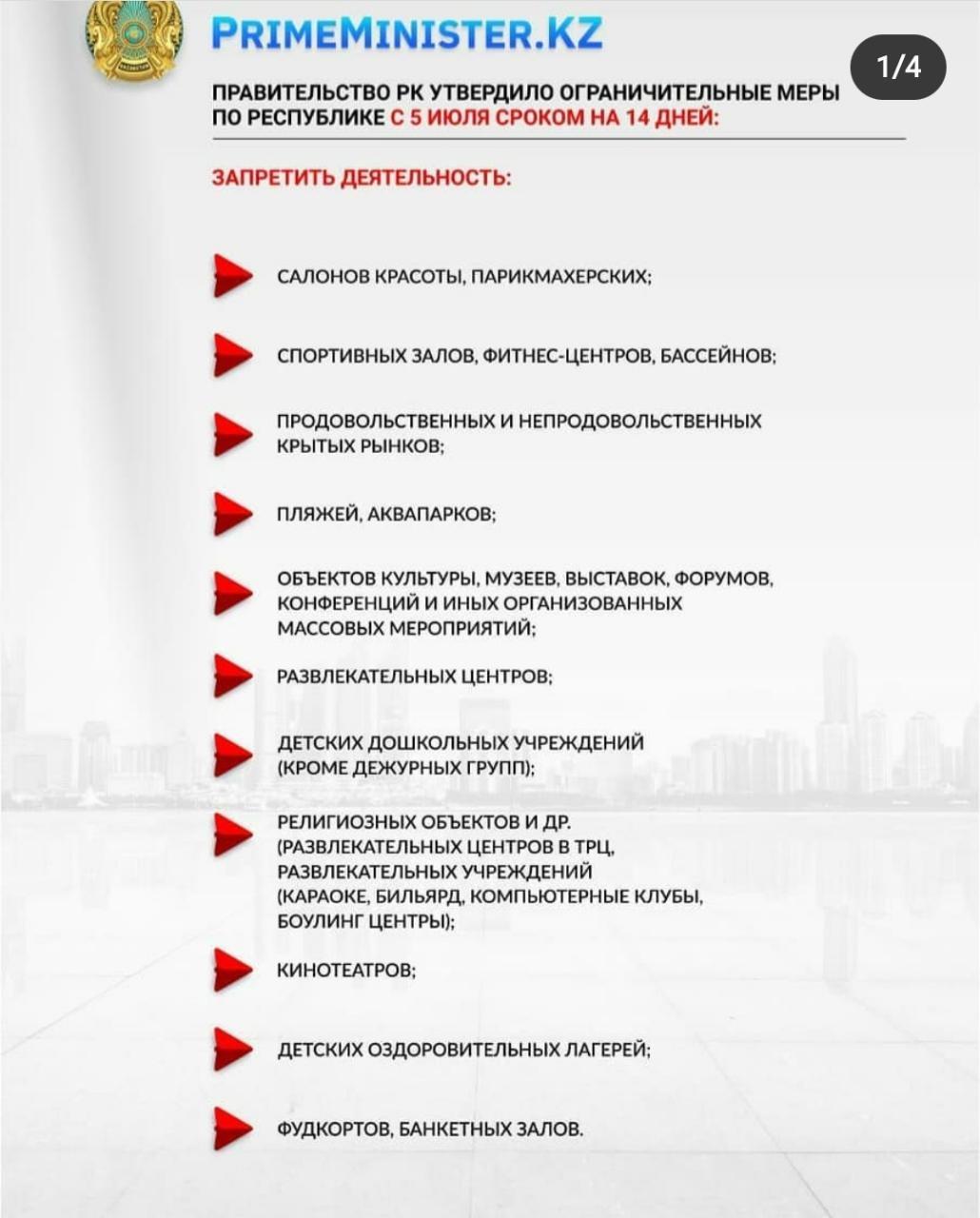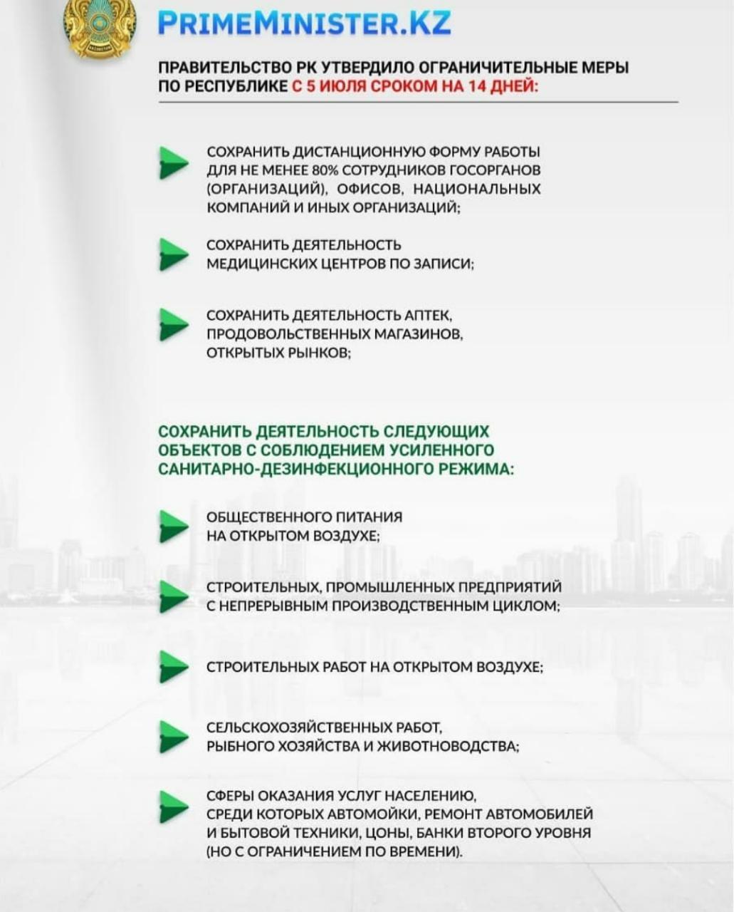 01 июль 2020 0 1 2 3 4 5 ПРАВИТЕЛЬСТВО РК УТВЕРДИЛО ОГРАНИЧИТЕЛЬНЫЕ МЕРЫ ПО РЕСПУБЛИКЕ С05ИЮЛЯ СРОКОМ НА 14 ДНЕЙ