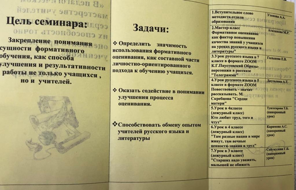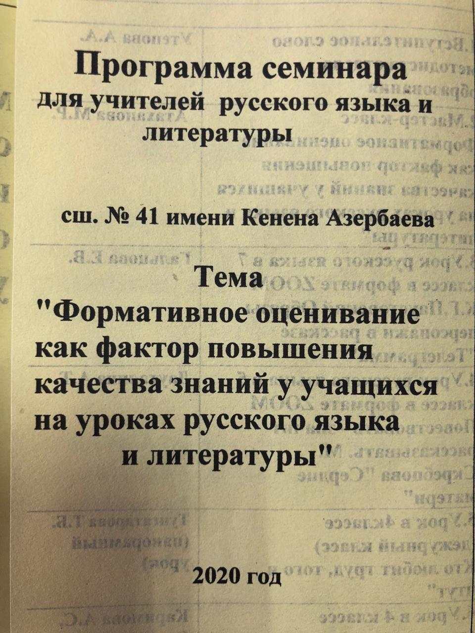 Районный семинар для учителей русского языка литературы. Тема: Формативные оценивание как фактор повышения качества знаний у учащихся на уроках русского языка и литературы. Цель семинара: Закрепление понимания сущности формативного обучения, как спос » Кенен Әзірбаев атындағы №41 орта мектебі