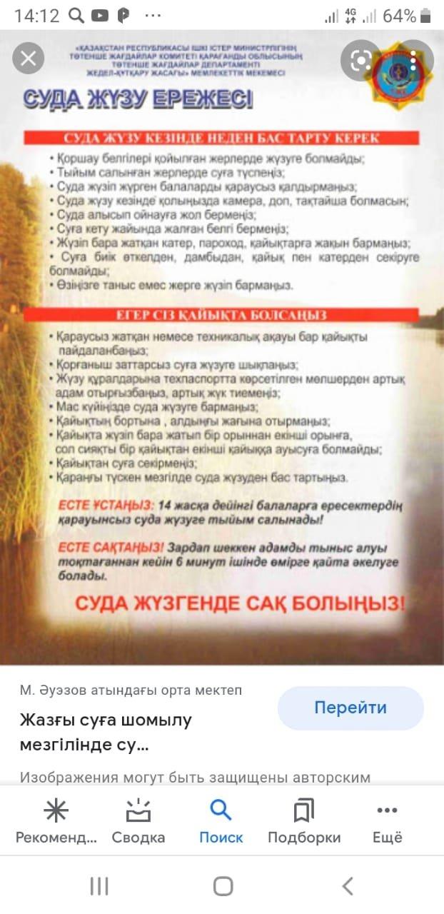 Балалардың жазғы демалысын ұйымдастыру қашанда маңызды мəселенің бірі болып саналады. Жыл сайын демалыс уақытындағы балалар мен жасөспірімдердің толық демалуларына, танып білу, шығармашылық және қоғамшылдық белсенділігін арттыруға, балалардың өзін - өзі ұйымдастыру қабілеттерін дамытуға, ғылыми, техникалық, көркем шығармашылық, спорт, саяхат пен өлкетану және басқа да танымдық қызмет түрлеріндегі білім мен іскерліктерін арттыруға жағдай жасау қажет. Жазғы демалыс балалардың жылдық бос уақытының айтарлықтай бөлігін алады.Ол мектептегі сабақтан гөрі баланың еркіндікке, өзі үшін қызықты істерді жасау және өз мүдделерінің еркін дамуы үшін қажеттіліктерін жүзеге асыратын кезең.Жазғы демалыс маусымында оқушылардың су айдындарында адам өмір қауіпсіздігі ережелерін сақтау оқушылардың ата-аналарына міндеттеледі. Оқушыларды жазғы демалыс кезіндегі қауіпсіздік шараларымен таныстыру мақсатында ауыл халқының көп шоғырланатын жерлеріне ескерту парақшалары ілініп, көпшіліктің назарына ұсынылды. Оқушылармен жеке түсіндіру жұмыстары жүргізіліп, судағы қауіпсіздік шараларының маңызды бөліктері бойынша түсініктеме беріліп, ескертілді.