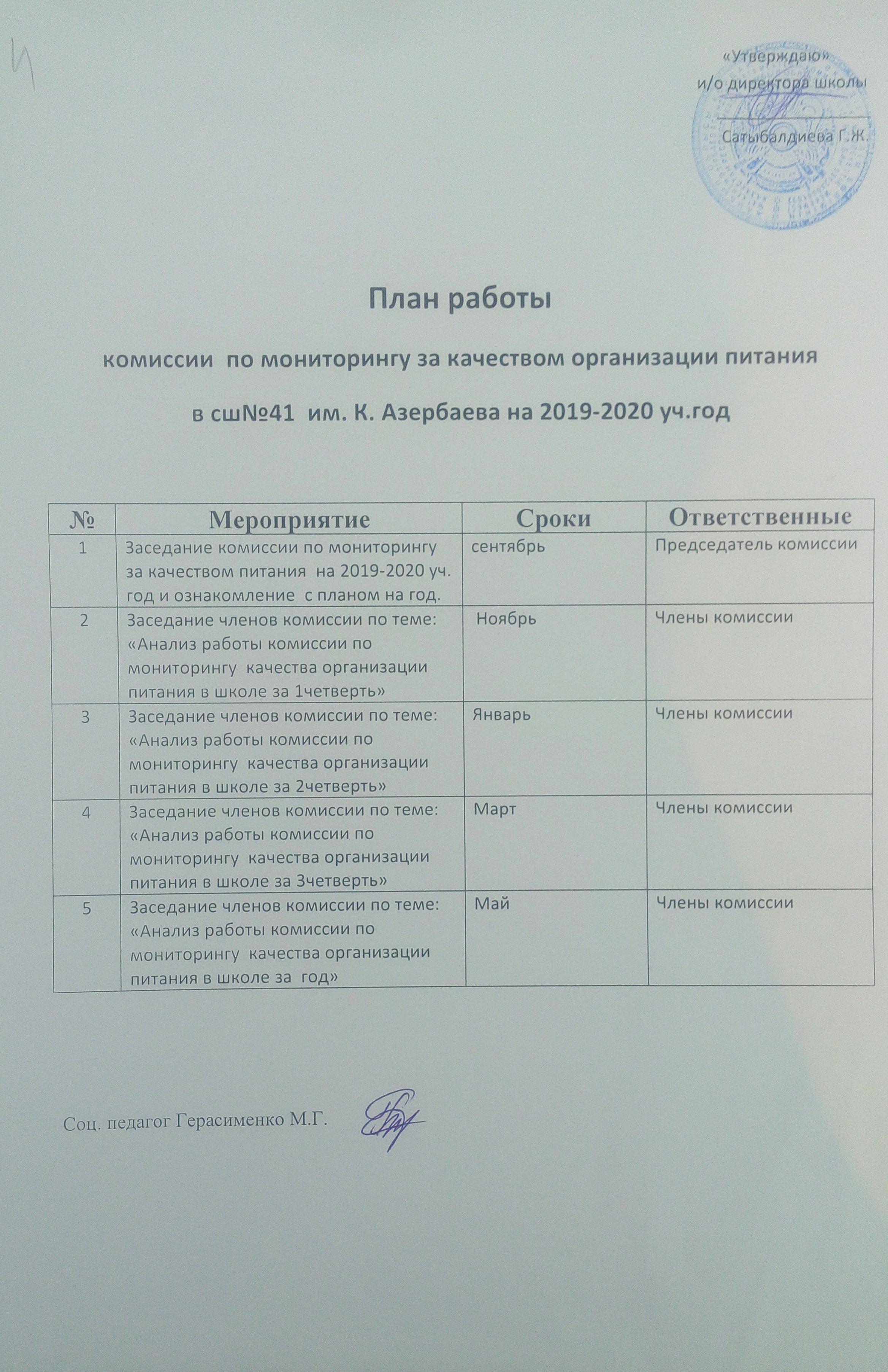 26 февраль 2020 0 1 2 3 4 5 План работы План работы коммиссии по мониторингу за качеством организации питания в сш №41 им К.Азербаева на 2019 - 2020 учебный год