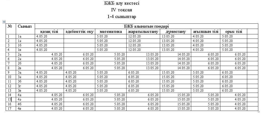 » » ІV тоқсан БЖБ алу кестесі 1-4 сыныптар