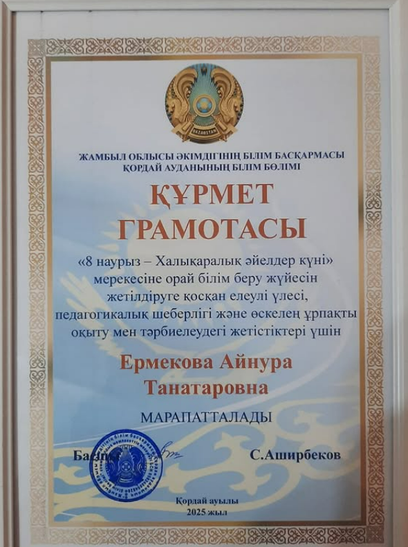 10 май 2025 0 1 2 3 4 5 информатика мұғалімі Ермекова Айнур Танатаровна құрмет грамотасымен марапатталды.